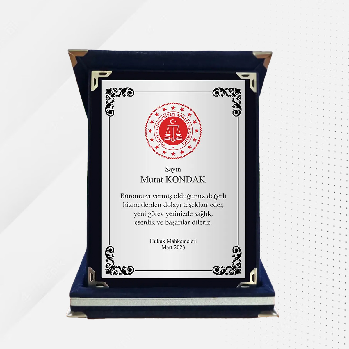 Antalya’daki adliyeler, barolar ve kamu kurumları için özel olarak tasarlanan bu model, resmi törenlerin vazgeçilmez klasiğidir. Kırmızı veya lacivert kadife dış kaplaması, iç kısmındaki gümüş veya altın rengi metal plaka ile birleşerek Adalet Bakanlığı ambleminin ve takdir metninin en vakur şekilde sergilenmesini sağlar.