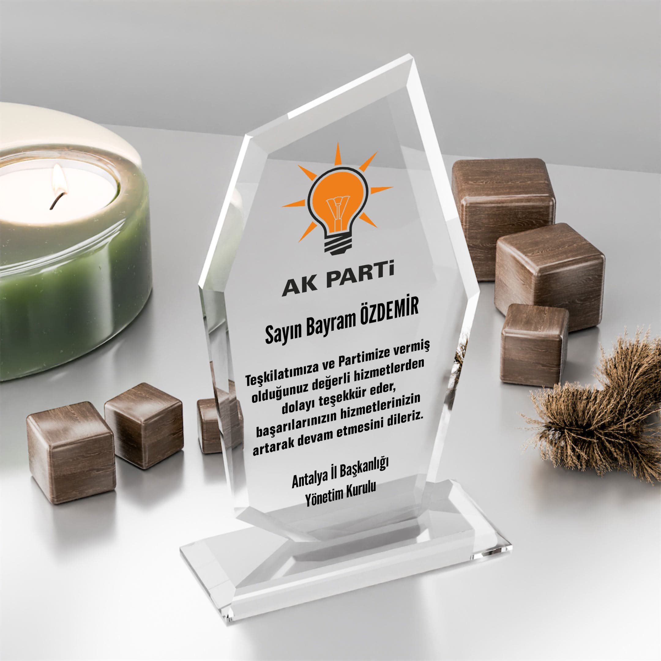 Ak Parti Plaketi, siyasi ve kurumsal ödül törenleri, hizmet takdirleri ve özel günler için özel olarak tasarlanmış anlamlı bir ödül plaketidir. Kaliteli kristal, cam veya ahşap malzemelerle üretilen bu özel ürün, hem görsel şıklığı hem de kurumsal ciddiyeti yansıtır.