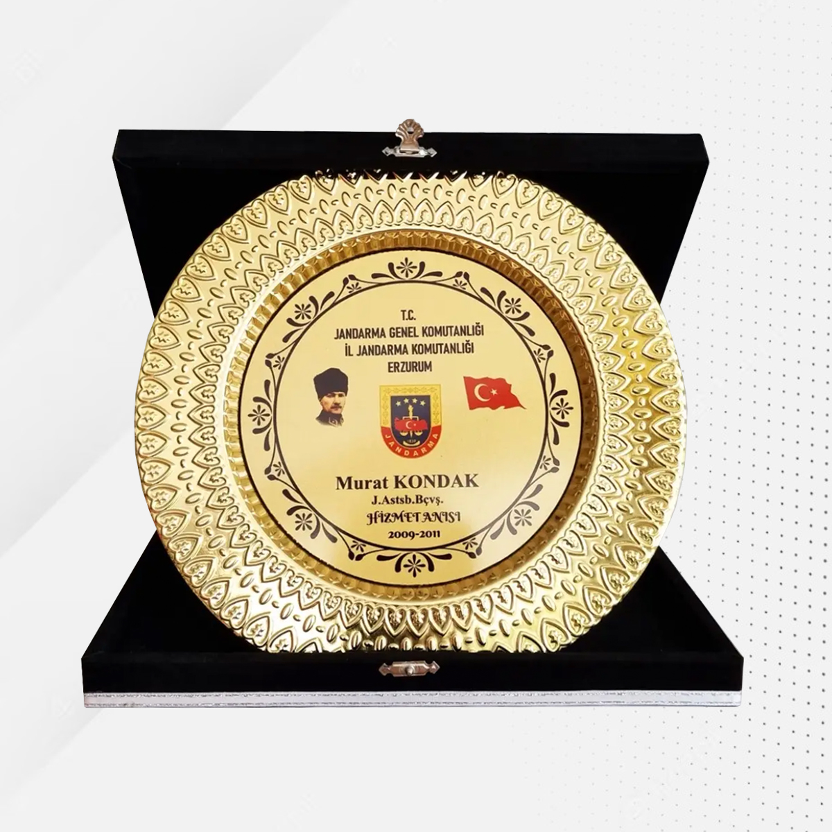 Antalya’nın seçkin organizasyonlarında başarının ve yüksek prestijin sembolü olan Altın Tabak Plaket Modelleri, 25×25 cm dev boyutları ve saray tabağı zarafetindeki tasarımıyla en üst düzey takdir nişanesidir. Lüks kadife muhafaza sandığı içerisinde sunulan bu modeller, Antalya’daki protokol törenlerinden uluslararası lansmanlara kadar her alanda ihtişamı temsil eder.