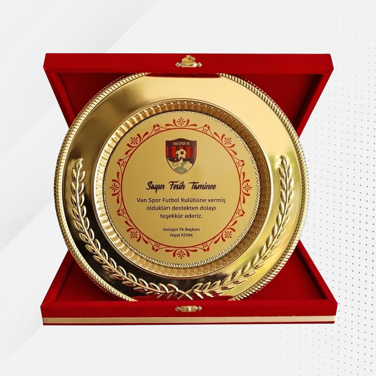 Antalya merkezli üst düzey kurumlar, holdingler ve turizm kompleksleri için üretilen bu özel seri, geleneksel el sanatları estetiğini modern altın kaplama parlaklığıyla birleştirir. 25×25 cm ebatlarındaki dev kare kadife kutu içerisinde yer alan altın renkli tabak, hem görsel kütlesi hem de yaydığı asalet ile ödül törenlerinin odak noktası olur.