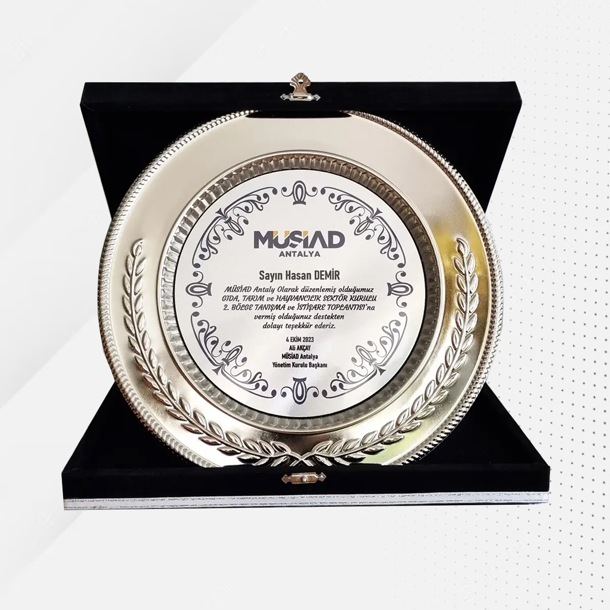 Antalya merkezli holdingler, kamu kurumları ve sivil toplum kuruluşları için özel olarak tasarlanan bu seri, geniş yüzey alanı ve lüks muhafazasıyla dikkat çeker. Genellikle 25 cm çapında üretilen bu tabaklar, hem altın hem de gümüş renk seçenekleriyle sunulur.