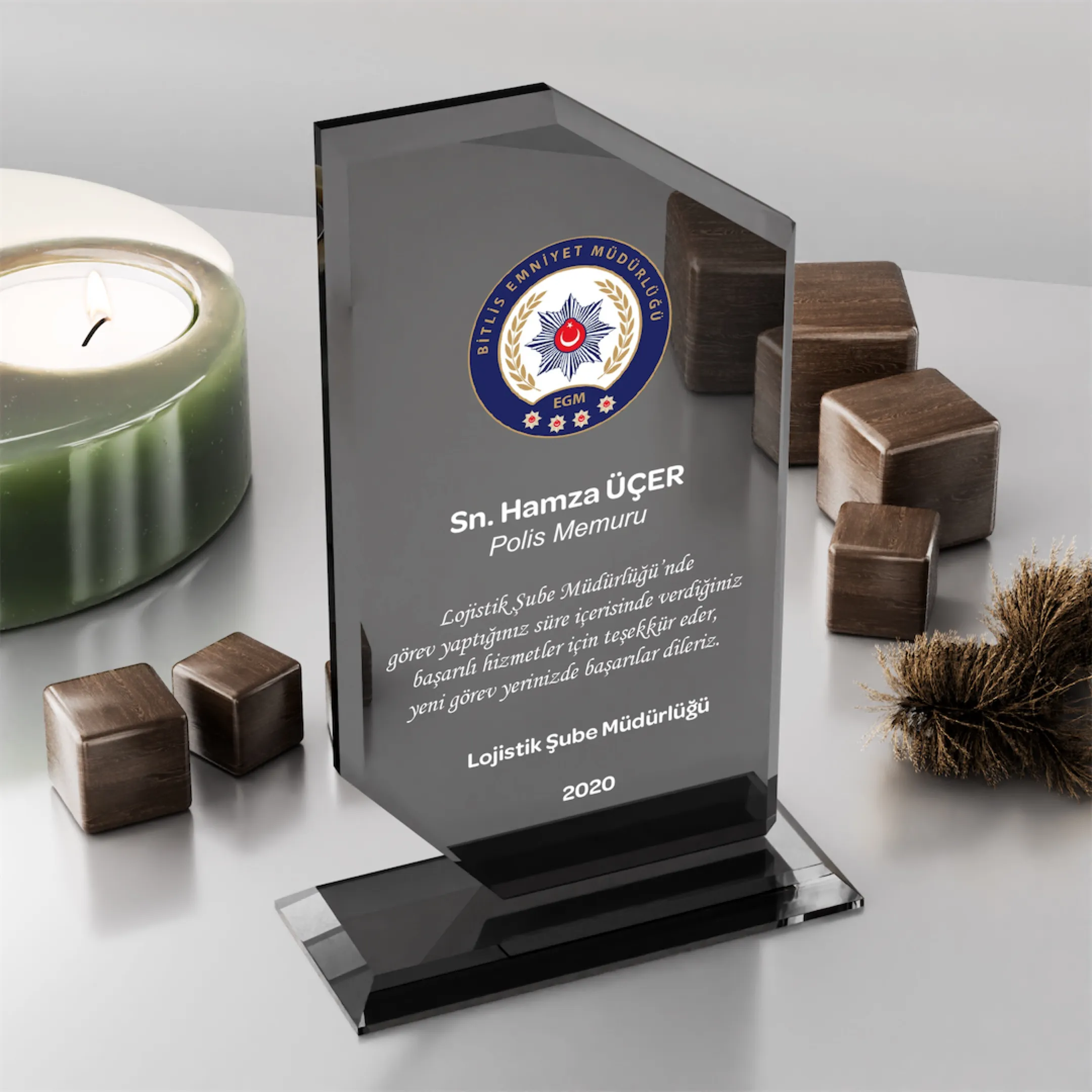 Antalya İl Emniyet Müdürlüğü, ilçe emniyet amirlikleri ve polis merkezleri için özel olarak ürettiğimiz bu model, emniyet mensuplarımızın başarılarını, tayinlerini ve emekliliklerini onurlandırmak için tasarlanmıştır. 12×20 cm ebatları, makam odalarında ve evlerdeki hatıra köşelerinde en asil duruşu sergiler.