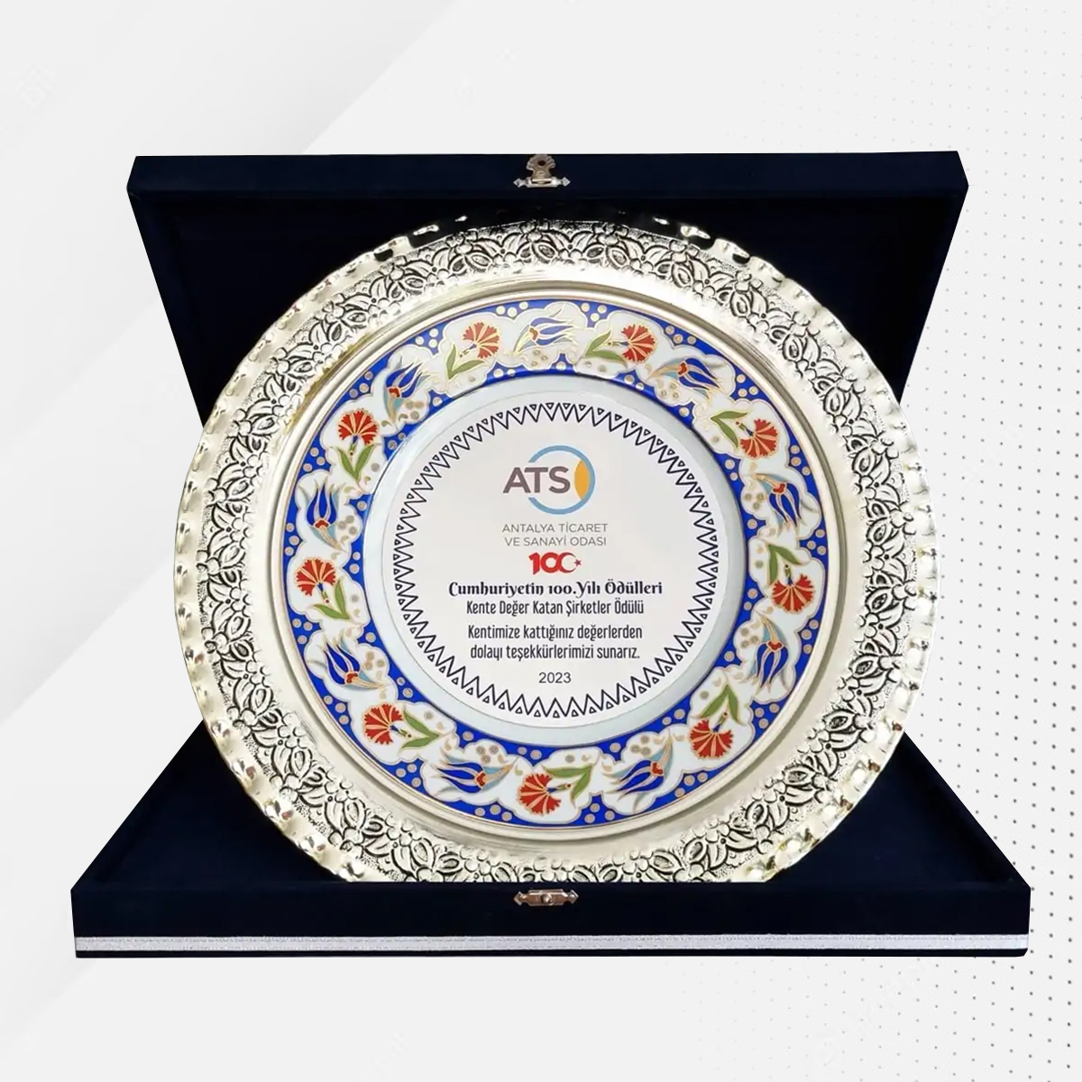 Antalya merkezli dev holdingler, beş yıldızlı otel zincirleri, ticaret odaları (ATSO, MÜSİAD vb.) ve resmi makamlar için özel olarak hazırlanan bu model, standart plaket anlayışını bir sanat eserine dönüştürür. 35 cm çapındaki devasa gövdesi, merkezdeki el işçiliği çini motifleri ve onu sarmalayan ağır gümüş çerçevesiyle sunulan takdirin büyüklüğünü her detayda hissettirir.