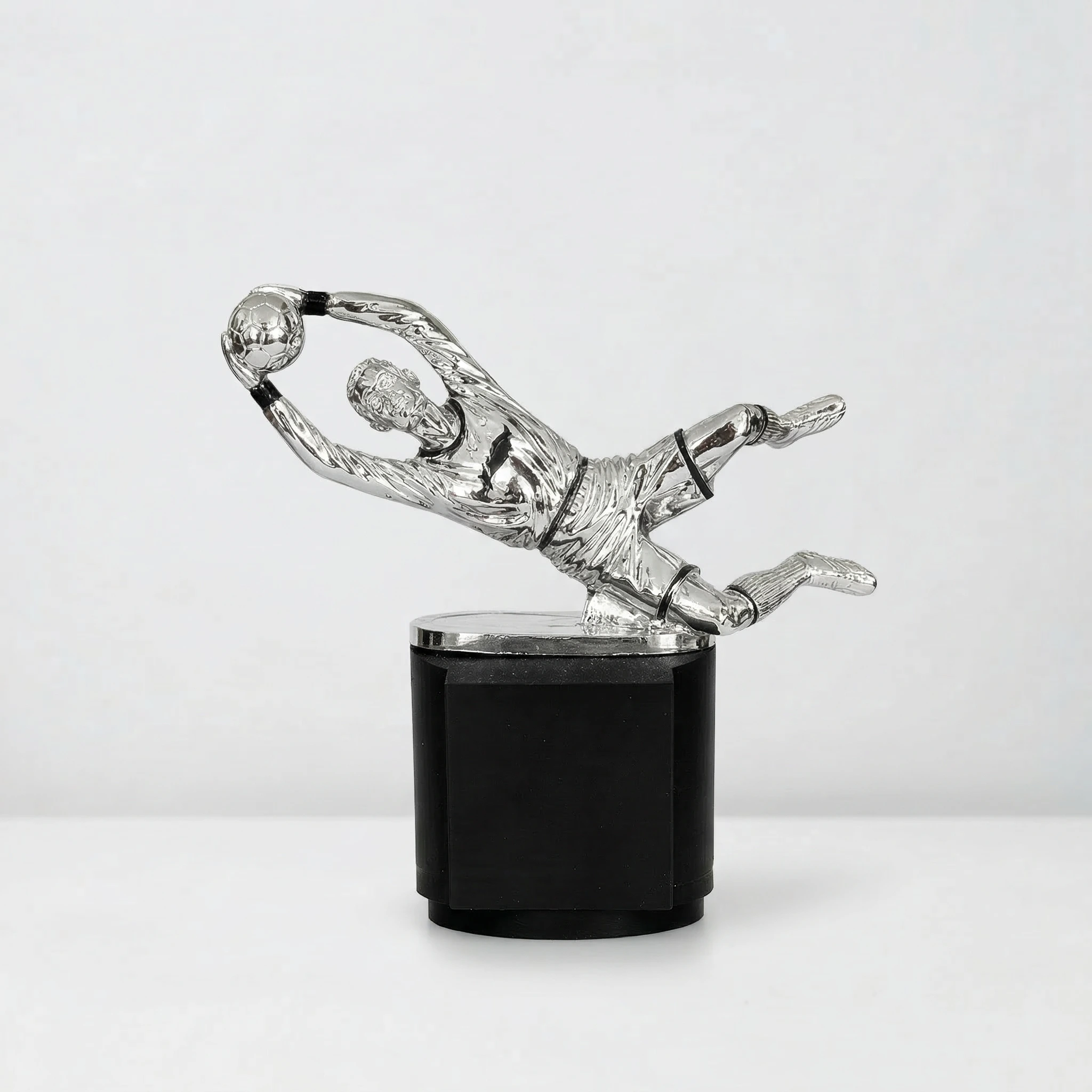 Göz Alıcı Tasarım: Havada süzülen kaleci figürü, gümüş rengin zarafetiyle birleşerek dinamik bir görüntü sunar.