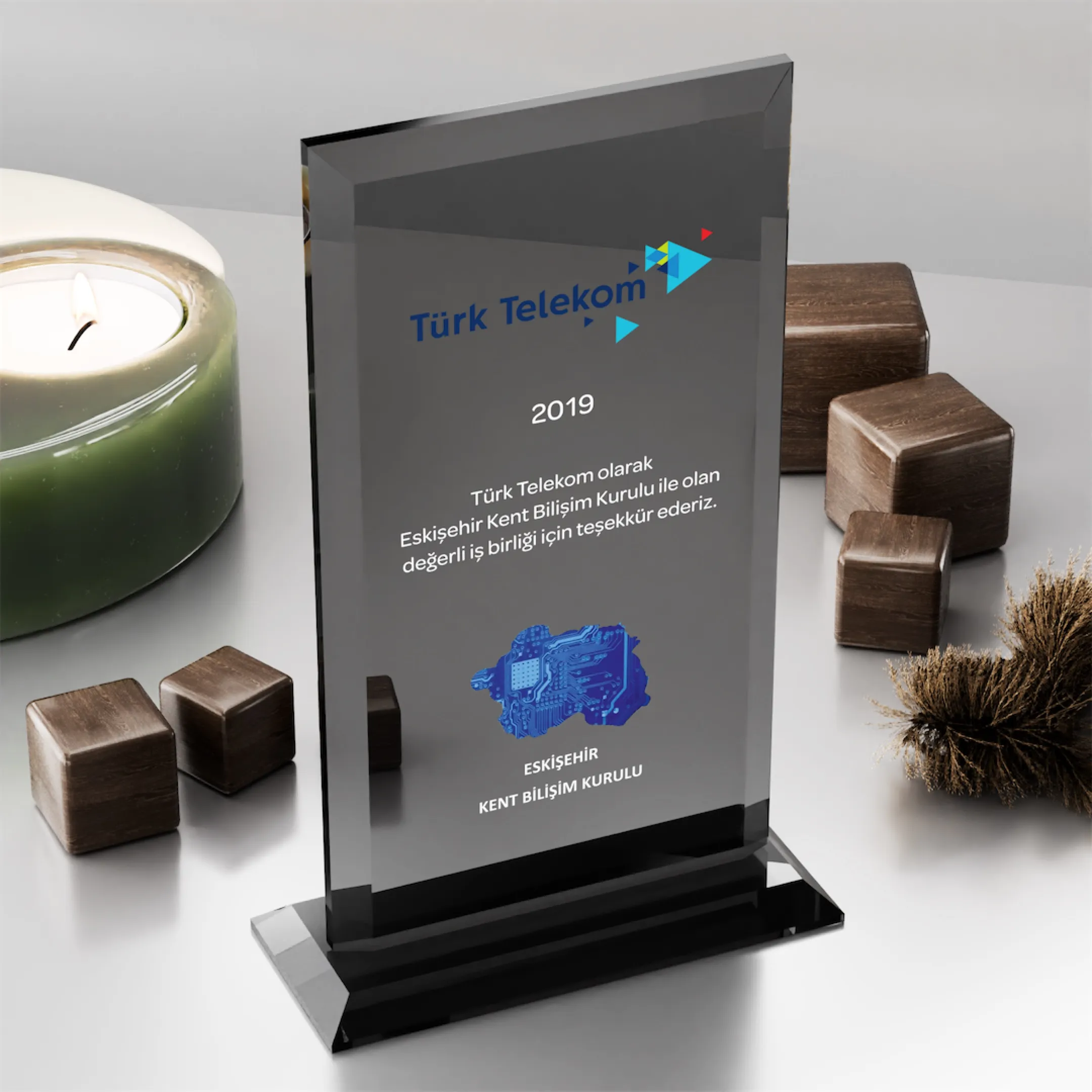 Antalya’daki kurumsal firmalar, mimarlık ofisleri ve teknoloji odaklı girişimler için özel olarak üretilen bu Füme Plaket, alışılmışın dışındaki rengiyle “farklılık ve asalet” simgesidir. 12×20 cm ebatlarındaki ideal formu, hem modern ofis dekorasyonlarına uyum sağlar hem de ödül sahibine verilen değeri yüksek bir estetikle yansıtır.