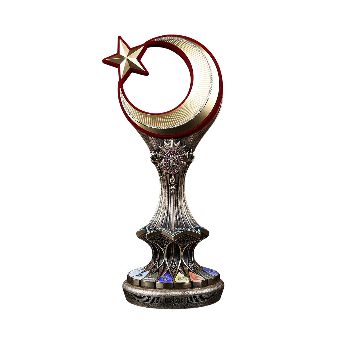 NAKKAŞ TÜRKBOYTU YORUMU Tarih 2023 Türkiye Cumhuriyeti’mizin 100. Yılına özel tasarladık TÜRKBOYTU’yu. Al bağrımızdaki ay yıldızımızı 100 kristal ile taçlandırdık, 100 yıla atfen; ‘’Bugünümüz ödediğimiz bedelleri unutmadan geldiğimiz yerdir’’ diyerek. Ve 100 yıldan ibaret bir millet olmadığımızı da hatırlatmak istedik. Tarih, köksüz hiçbir ağaca şahit olmamıştı. Nitekim biz de gölgesi cihanın bir ucuna dayanmış 600 yıllık Osmanlı Devleti’nin mirasçısıydık. Bu mirasa istinaden TÜRKBOYTU’yu bir yönünde Osmanlı Devlet armasına yer verdik. Bayrağımızın cihanşümul ecdadın devletli mirası olmasına binaen hususiyetle sancaklarımızın ay yıldızlarını boyutlu tasarladık. TÜRKBOYTU’nun diğer yönünde armadan ayırarak kullandığımız kalkan ile hem Cumhurbaşkanlığı Armasının kaynağına hem de maddi-manevi üstünde yükseldiğimiz zemine işaret etmek istedik. Osmanlı Devleti’nin temelinde Selçuklulara ait 300 yıllık bir inşa ve inkişaf süreci vardı. Bu süreği ifade edebilmek adına bu alanı Selçuklu Yıldızı formunda tasarlarken Türk Rengi Turkuaz kristaller ile renklendirdik. Dönemin tezyin üslubunu gözeterek; mukarnas yorumumuz ve rumi motifler ile işledik. Selçukluların da evvelinde milattan önceye kadar uzanan bir Türk tarihi vardı. Türklerin, tarihî serüveni içerisinde kurduğu tüm Türk Devletlerini ve milletlerini temsilen Selçuklu geçmelerinden oluşturduğumuz TÜRKBOYTU’nun kaidesine 16 Türk Devleti’nin bayraklarını, Türk Kâğıdı olarak tanınan ebru yöntemi ile bezeyerek nakşettik. Zira bilirdik ki ‘’Köklerinden uzağa düşmemek, her yükselişin üstünde durduğu kaidedir.’’ İşte Türkiye Cumhuriyeti’miz yüzünü daima ileriye dönebilme gücünü köklerindeki bu kadim geçmişten kesbeder. ‘’Bu kadar güçlüyse beslendiği arz, bir o kadar yer verecektir izzetine arş’’ diyerek bayrağımızı dua niyetine gökyüzüne bakar şekilde konumlandırdık. TÜRKBOYTU’da baştan aşağı Türk Milletinin tarihi devamlılığını anlattık. TÜRKBOYTU’yu ALEM formunda tasarlayarak Türk Milletinin İslâm’la nasıl özdeşleştiğini resmetmeye çalıştık. Hülâsa… Her defasında küllerinden yeniden, yeniden ve daha büyük dirilen Cihan Fatihi bu milletin tarihi vardır TÜRKBOYTU’nun Alem’den gövdesinde. Şimdi gözlerimizi kaldıralım yavaşça ve bir daha bakalım TÜRKBOYTU’ya. Kaç yüz yıl? Kaç bin yıl?.. Ruh aynı ruh değişen sadece beden Bir tarihtir izlediğin kökü maziden . . . . TÜRKBOYTU ürünümüzün teknik özelliklerini size şu şekilde anlatmak isteriz: *TÜRKBOYTU ürünümüzün hammaddesi polyesterdir. * TÜRKBOYTU’yu üç boyutlu ve çift yönlü tasarladık. *Alem formunda tasarladığımız TÜRKBOYTU üç kısımdan oluşur: Tepelik, gövde ve kaide… Tepelik kısmında bulunan Türk Bayrağı’nı 1.sınıf flok malzeme ile kaplayarak oluşturduk. Ön ve arka yüzü farklı tasarladığımız TÜRKBOYTU’nun gövde kısmında Osmanlı Devleti’ni temsilen Osmanlı Devlet Armasını kullandık. Ön yüzünde sadece kalkanı ön plana alırken; arka yüzünde Osmanlı Devlet armasını seçtiğimiz unsurlarla detaylandırdık. *Kaide bölümünü ise; Selçuklu Devleti’ni temsilen Turkuaz taşlarla bezediğimiz Selçuklu Yıldızı oluşturur. Bu bölüme mukarnas yorumumuz ve aynalarına eklediğimiz 8 farklı rumi deseni eşlik eder. *Kaidenin en alt kısmında; Selçuklu geçmeleri ile tasarladığımız alanın içinde 16 Türk Devletinin bayraklarına yer verdik. 16 Türk Devletinin bayraklarını ise geleneksel sanatlarımızdan olan Ebru yöntemi ile kapladık. TÜRKBOYTU’ nun en altında; kaide çemberinde kufi hat sanatı ile istif ettiğimiz: ‘’Ruh aynı ruh değişen sadece beden Bir tarihtir izlediğin kökü maziden’’ mısraları yer almaktadır. * TÜRKBOYTU’nun yüzeyini metal pigmet içeren boya ile renklendirirken, antik sarı görüntüsünü elde etmek için farklı tekniklerde boyama işlemleri de uyguladık. veTÜRKBOYTU’nun üzerindeki tüm görsel ve fikirsel detayların belirginliğini sağlamak adına son derece titiz bir tasarım ve üretim aşamalarından geçtik. *TÜRKBOYTU’yu sizlere; ürünün kendisine özel tasarladığımız özgün kutusu ile göndermekteyiz. Kutu içerisinde TÜRKBOYTU’nun her bir detayını ince ince anlattığımız TÜRKBOYTU tanıtım kitabı ile göndermekteyiz. . . . . NAKKAŞ BOYTU Gelenekten Geleceğe… Hakkımızda Nakkaş Boytu olarak; geleneksel kültürümüzün iki boyutlu düzlemdeki yazı ve çizi sanatlarını, üç boyutlu yorumlayıp üretiyoruz. Bu süreçte geleneksel sanatların; sadece çizgilerini ya da desenlerini, tekniklerini yahut tanımlarını değil; ruhunu da hikâyelerini de eklemeye gayret ediyoruz. 1997’de çıktığımız bu yolda geleneksel fikri ve kültürü yeni bir formla gelecek nesillere ulaştırabilme heyecanı ile geleneğimizin iç boyutunu üç boyuta taşıma hedefi ile ilerliyoruz. BOYTU Nedir? Boytu; Türk İslam sanatlarının üçüncü boyutudur. Geleneksel Sanatlar kapsamında değerlendirilmesi gereken, henüz kendi alanını inşa etmekte olan bir boyut. Nasıl ki hat çizgi demek BOYTU da boyutlamak demek. Bir de ek ismi var Boytu’nun: “BOYTU MÜCERRET”. Mücerret soyut demek. Boytu mücerret; soyutun boyutlanmış hali. Neden BOYTU? 2004 yılında ilk örneğini ortaya koyup, adını koyamadığımız bu boyuta -her ne kadar içimize sinmemiş olsa da- o günün şartlarında biblo denildi. Bugün ise; bize ait olanı ifade etmeyen bu adlandırmadan duyduğumuz rahatsızlığı telâfi çabasındayız. Masa, raf vb. üzerine konulan, farklı malzemelerden yapılmış süs eşyalarını karşılayan terim olarak ‘’biblo’’ ismi kullanılıyor. Tasarımlarımız; form olarak biblo adlandırmasına yakın gibi görün