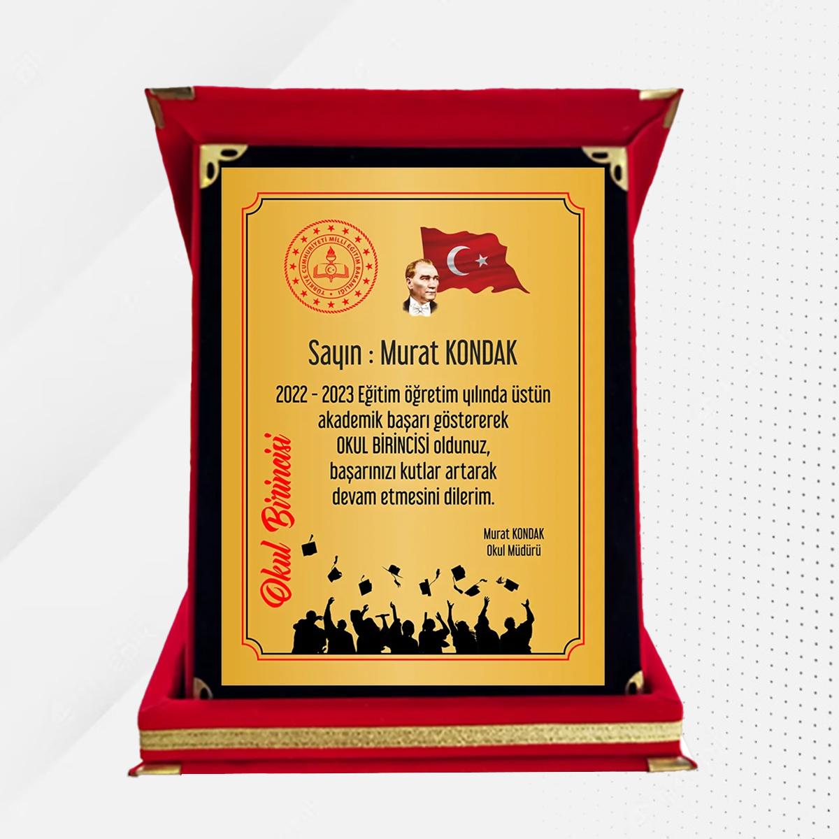 Yüksek Kontrastlı Metal Plaka: İç kısımdaki altın veya gümüş rengi metal yüzey, başarı mesajının ve okul logonuzun kristal netliğinde parlamasını sağlar.