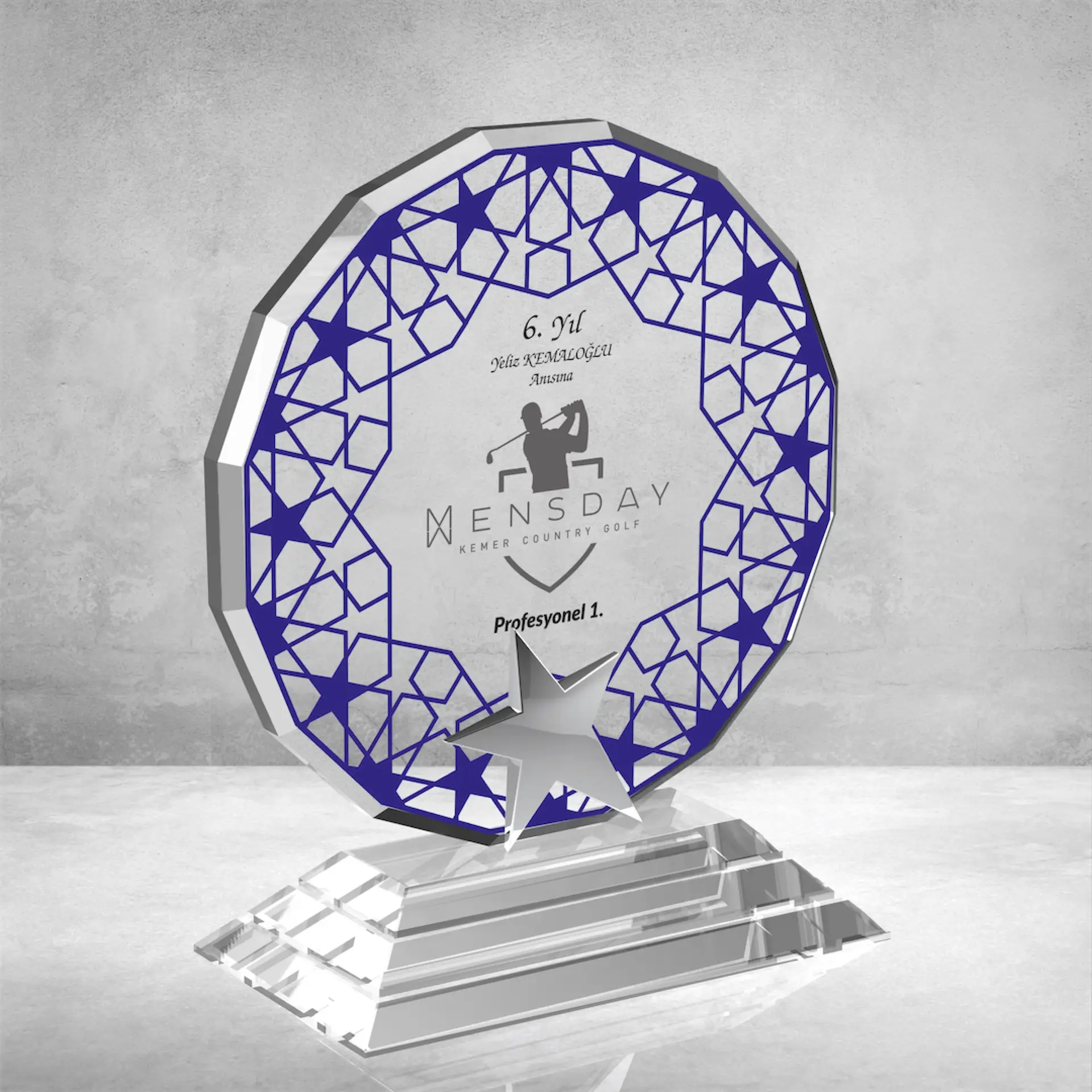 Estetik Dairesel Form: 20 cm genişliğindeki yuvarlak cam kesimi, yumuşak hatlarıyla modern bir duruş sergilerken başarının bütünlüğünü vurgular.